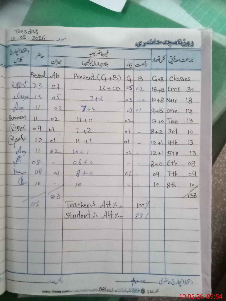 | Total Students Present | 0 | 23 | 11 | 11 | 9 | 13 | 11 | 8 | 7 | 10 | 116 | |||||