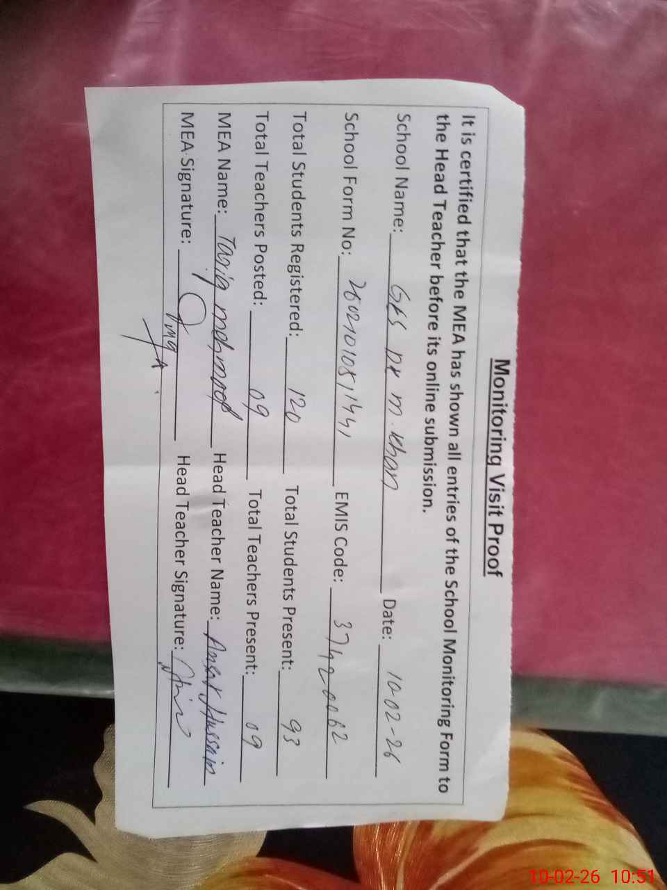 | Certified that this School was Inspected by the Undersigned MEA/DMO Today and the Information Stated Above is as Per Record. | |||||