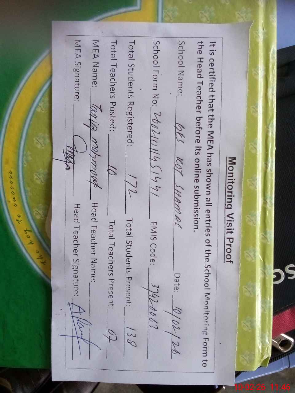 | Attendance Register | Head Teacher | MEA with School | Visit Proof |