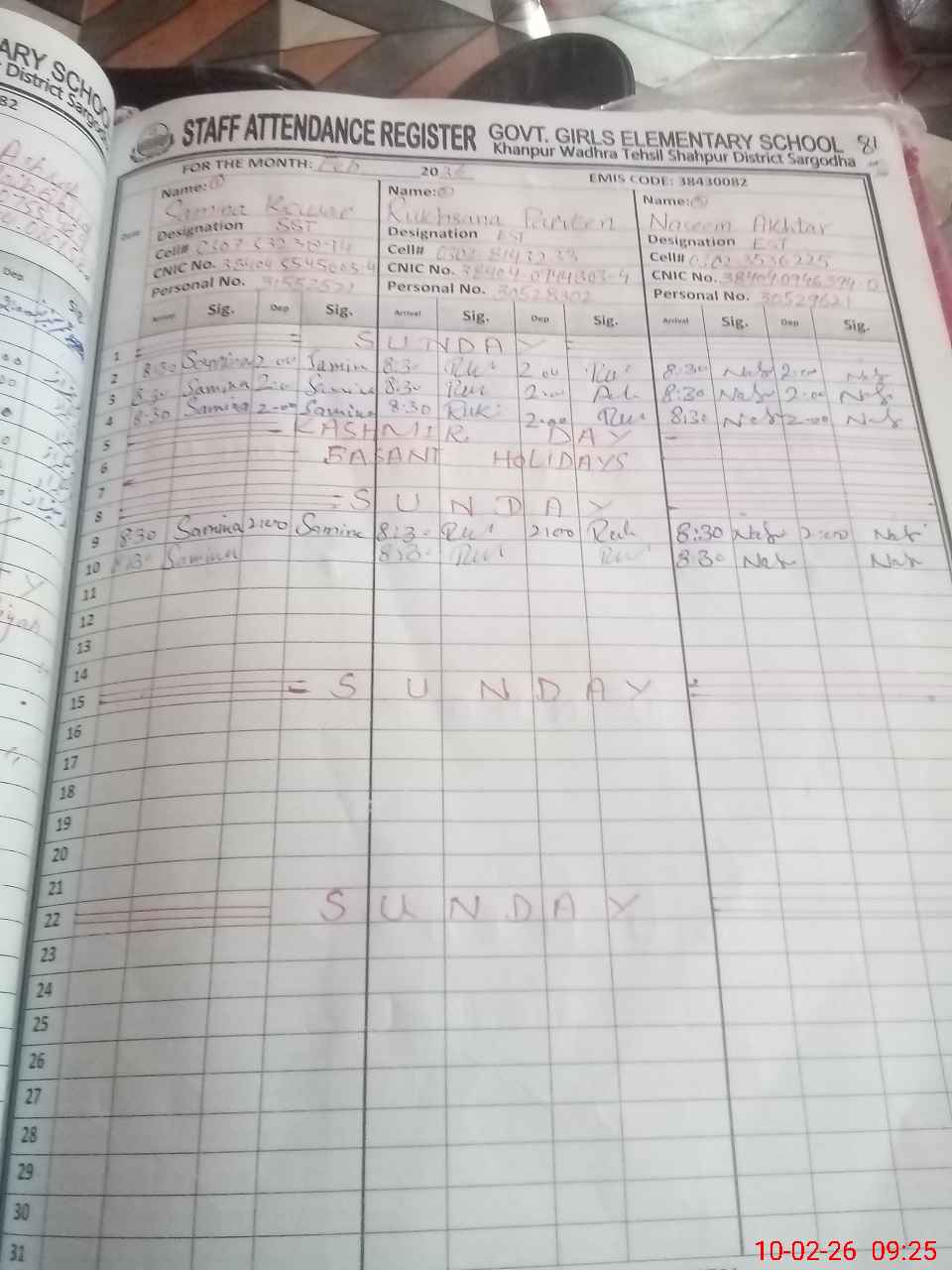 | CNIC | Full Name | Designation | R/C | Absence During Last Calender Month |