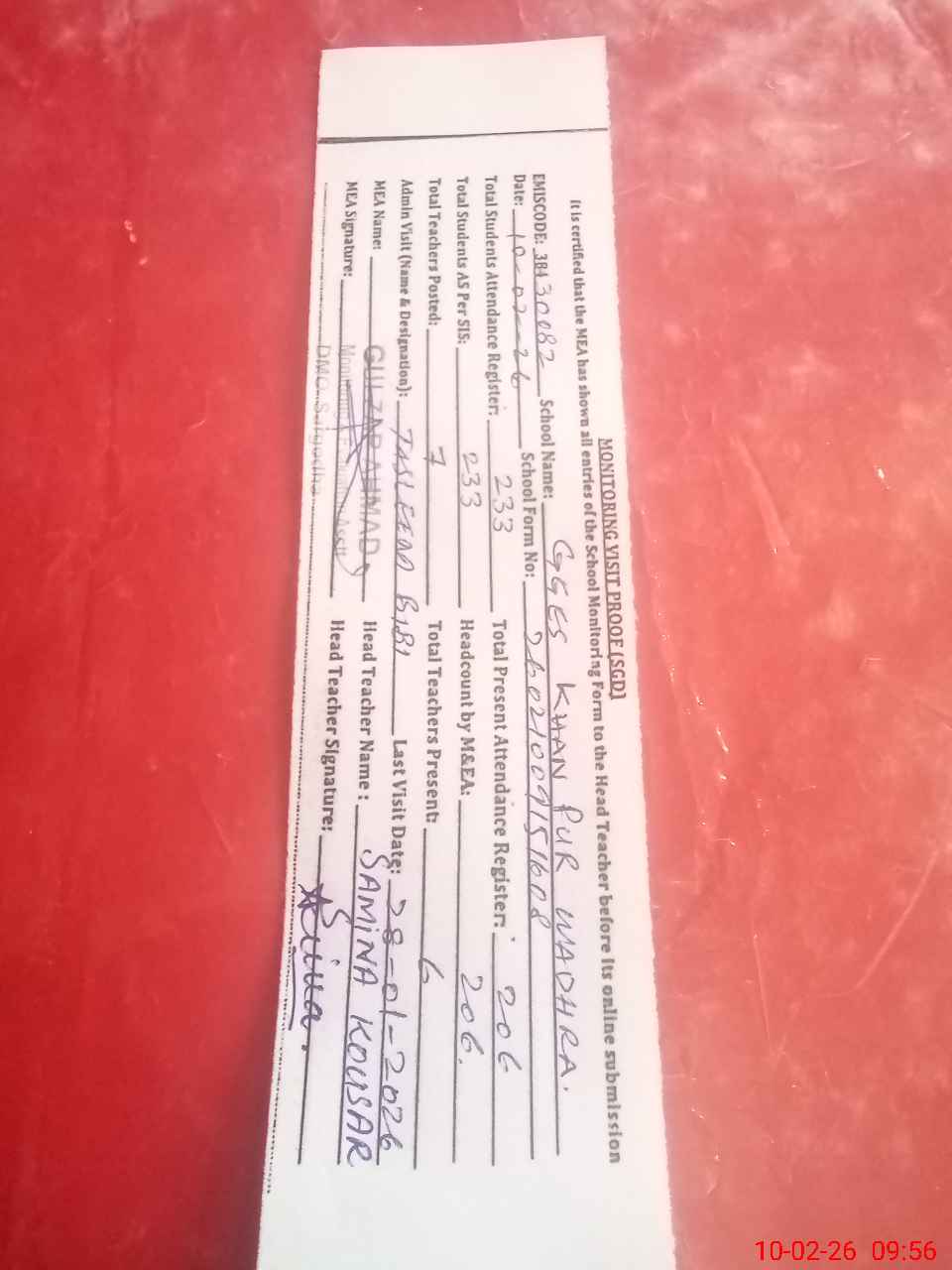 | Attendance Register | Head Teacher | MEA with School | Visit Proof |