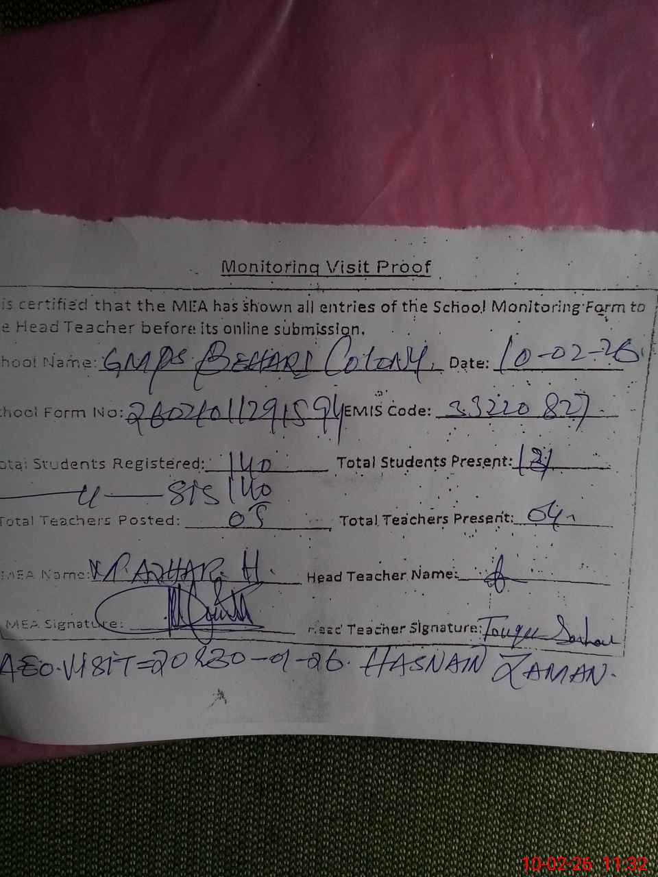 | Attendance Register | Head Teacher | MEA with School | Visit Proof |