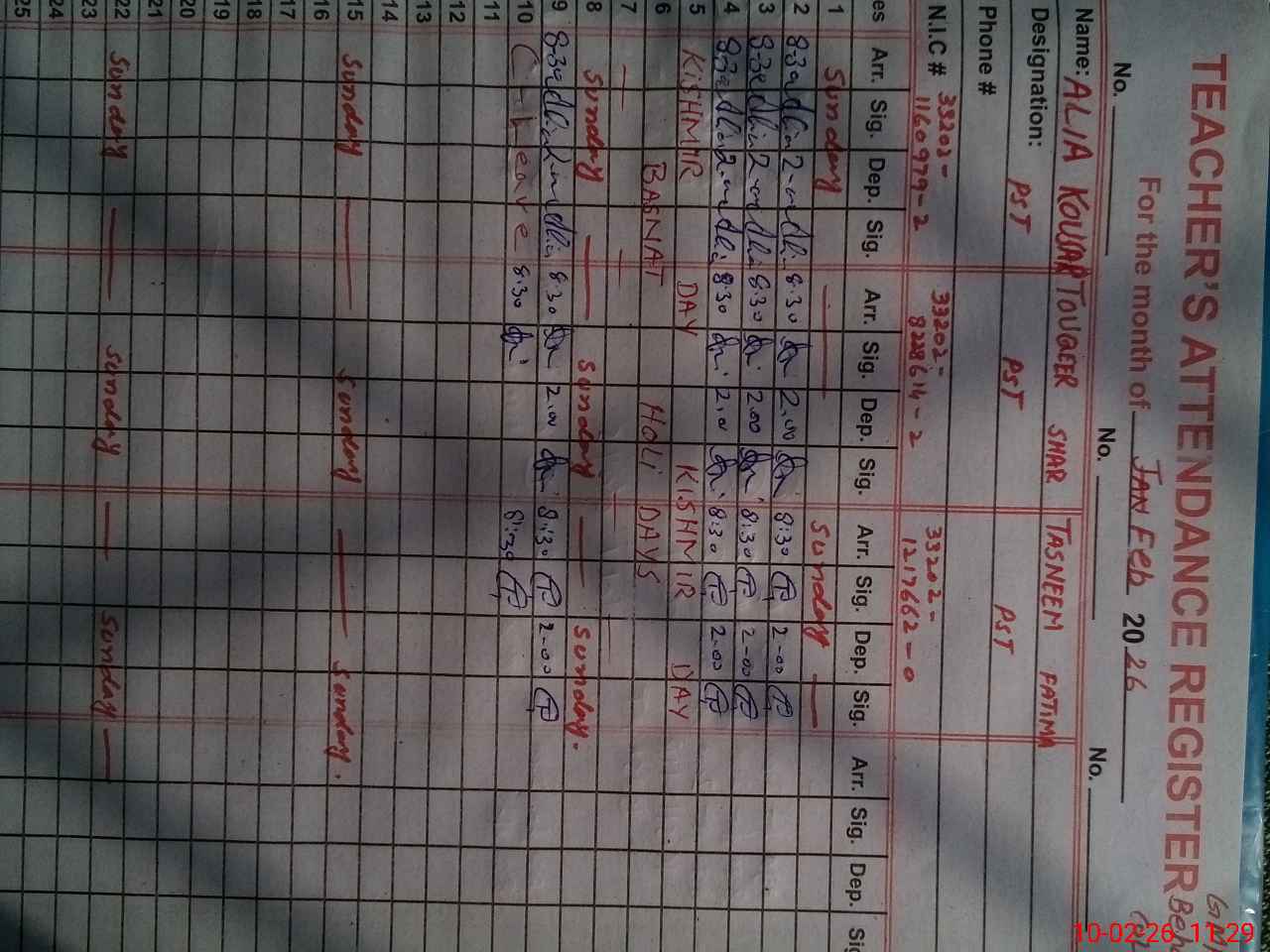| CNIC | Full Name | Designation | R/C | Absence During Last Calender Month |