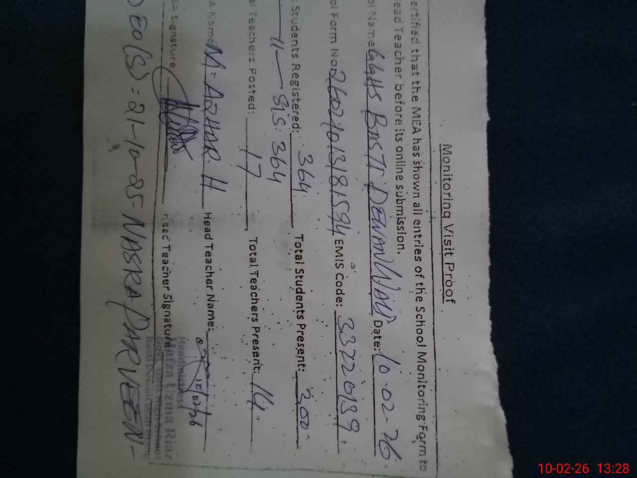| Certified that this School was Inspected by the Undersigned MEA/DMO Today and the Information Stated Above is as Per Record. | |||||