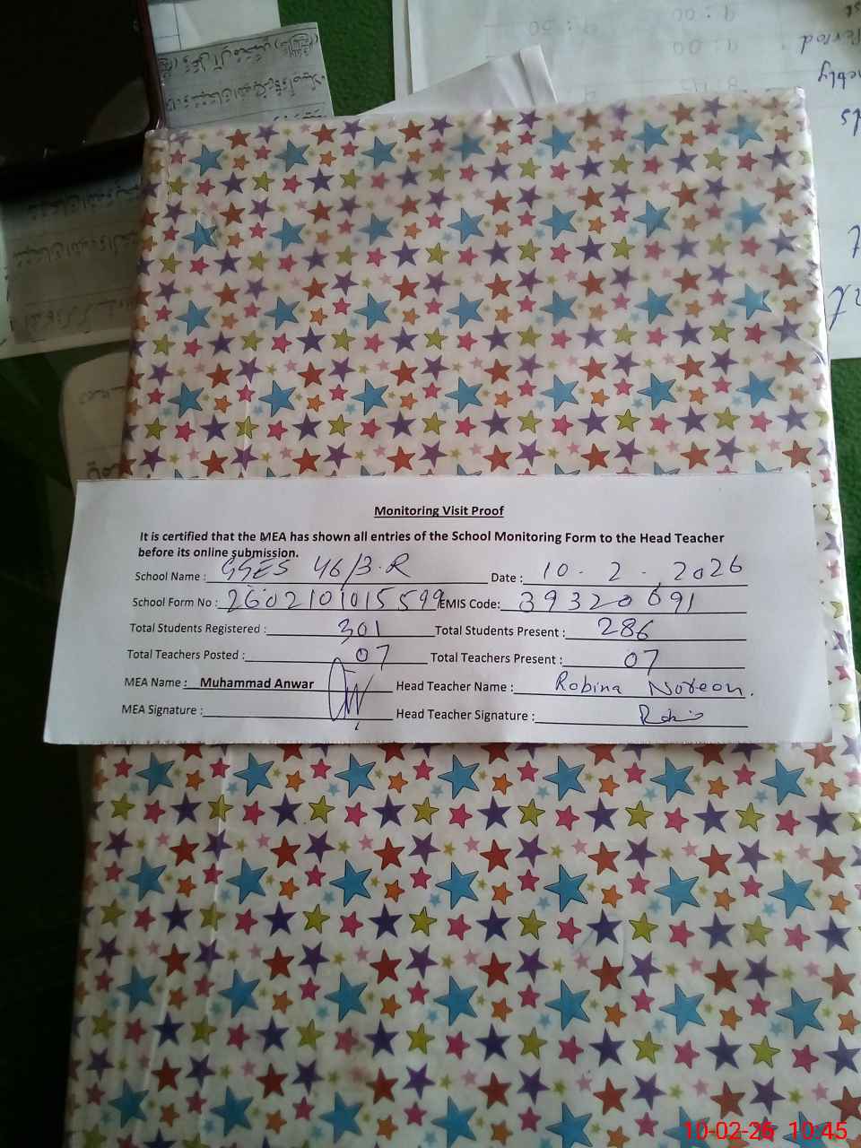 | Attendance Register | Head Teacher | MEA with School | Visit Proof |