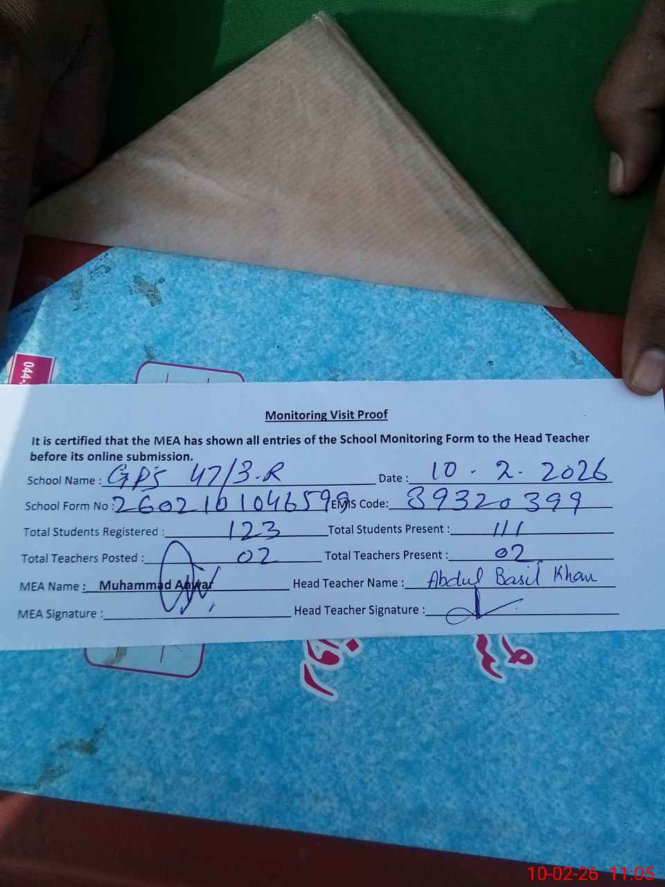 | Attendance Register | Head Teacher | MEA with School | Visit Proof |