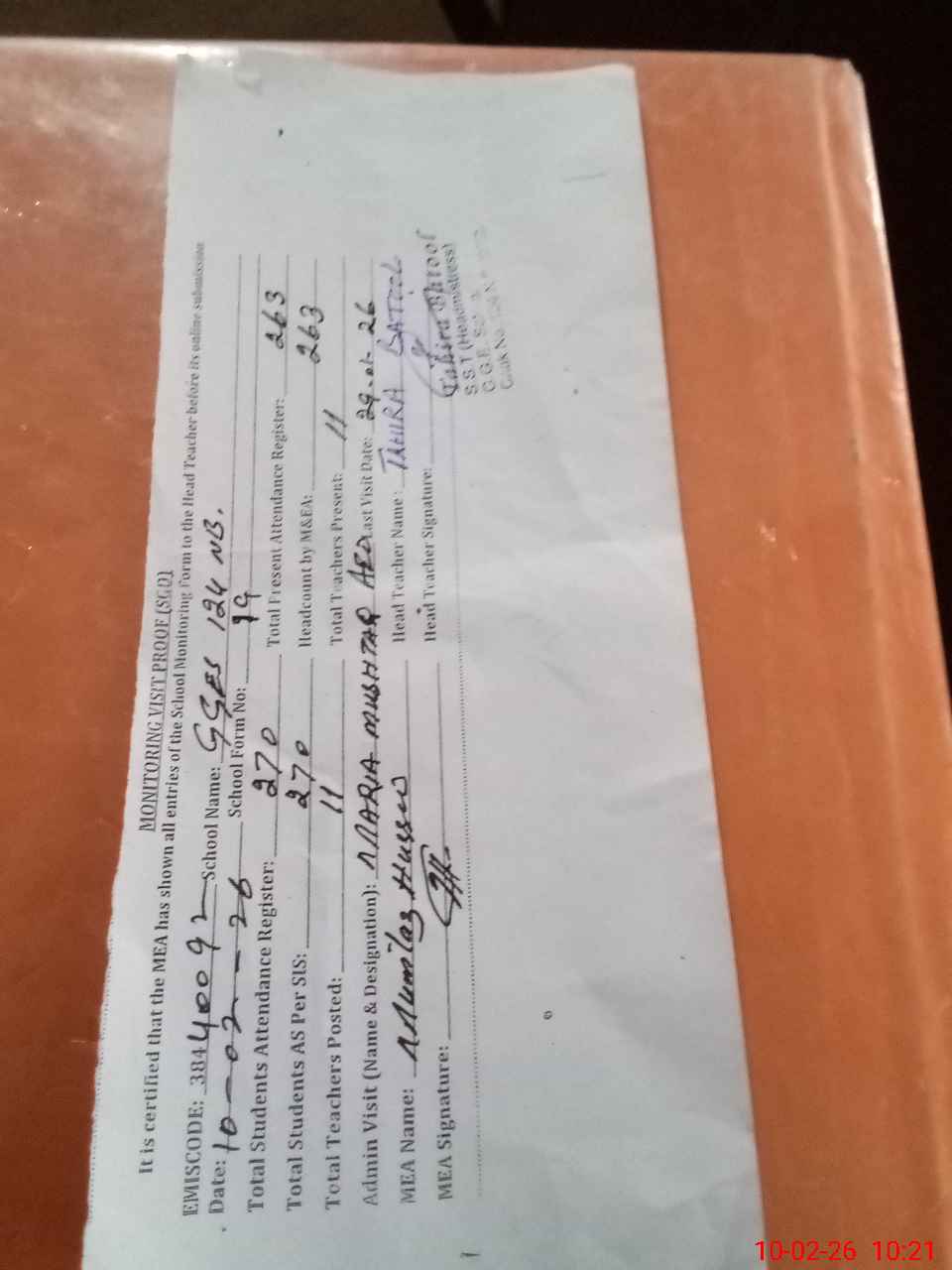 | Attendance Register | Head Teacher | MEA with School | Visit Proof |