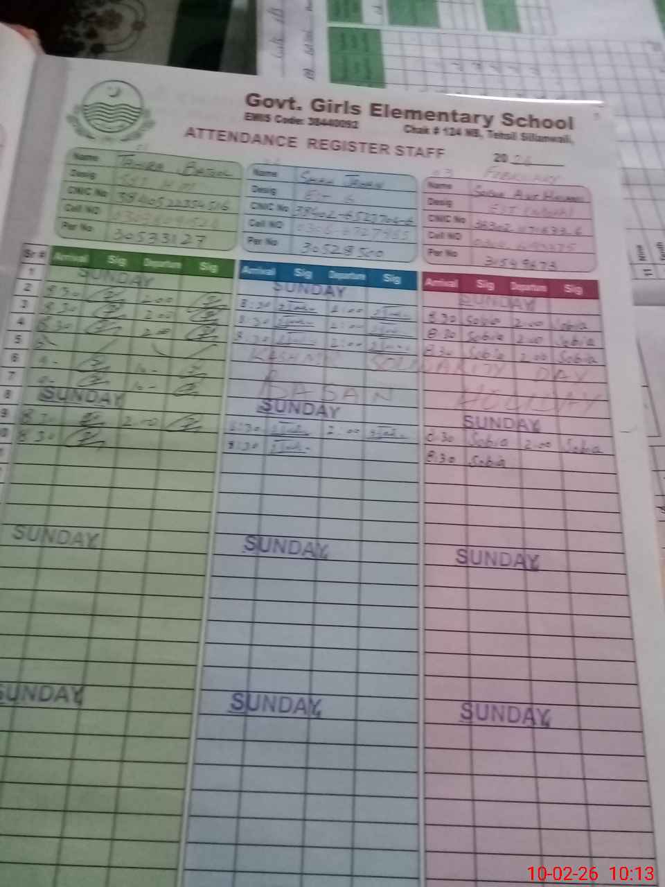 | CNIC | Full Name | Designation | R/C | Absence During Last Calender Month |