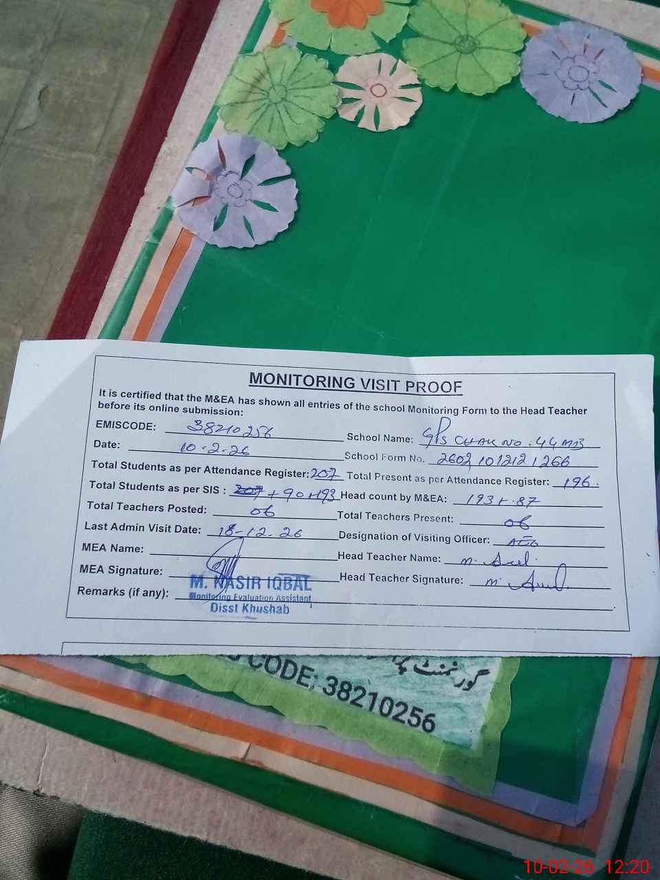 | EMIS Code: 38210256 | Name of School: GPS CHAK NO 44 MB | |||