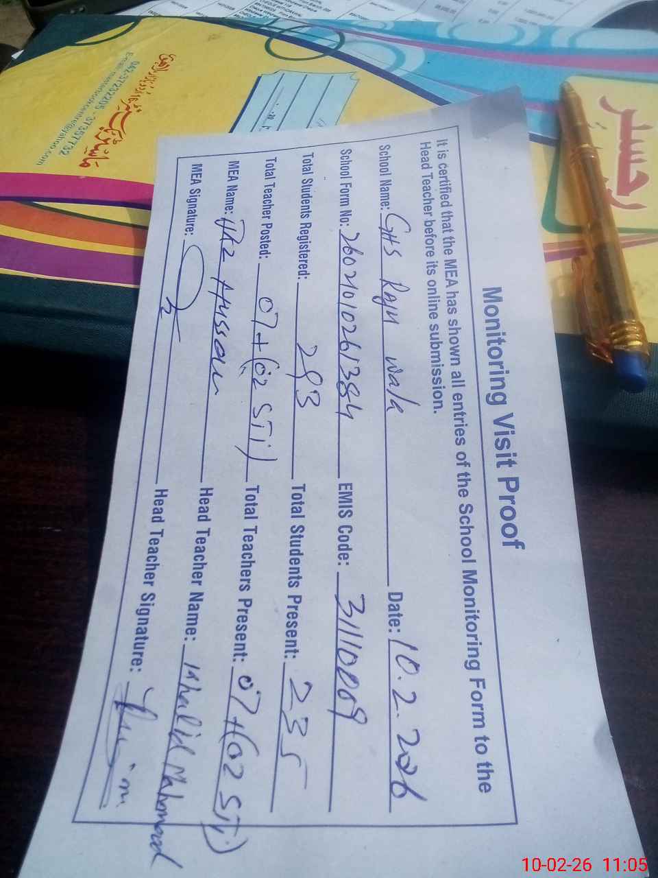 | Attendance Register | Head Teacher | MEA with School | Visit Proof |