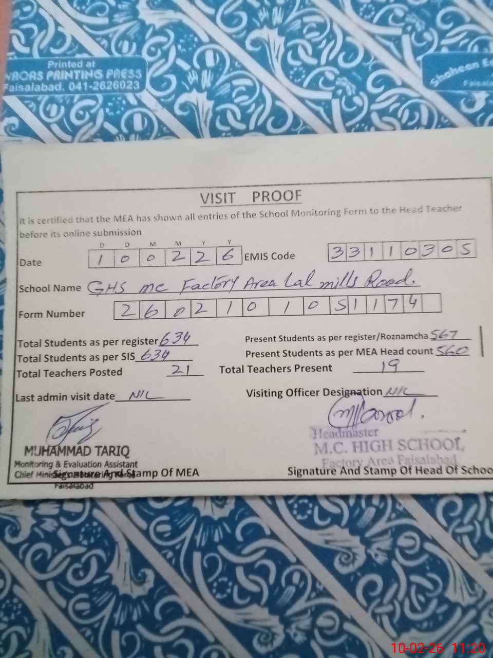 | EMIS Code: 33110305 | Name of School: GHS MC FACTORY AREA LAL MILLS ROAD FSD | |||