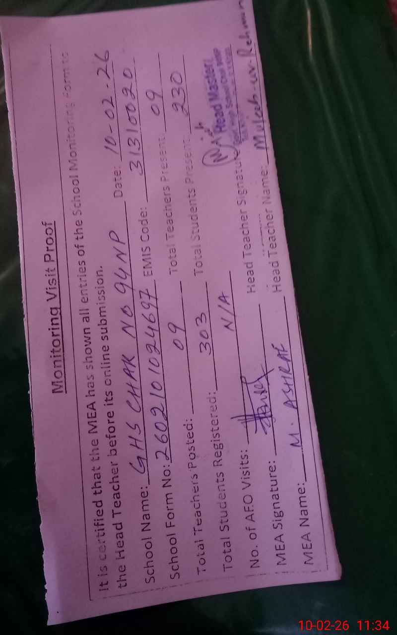 | Remarks (Use Separate Page if Required): ENROLLMENT TAKEN FROM ATTENDENCE REGISTERS OF STUDENTS ATTENDENCE OF STUDENTS CARRIED OUT BY HEAD COUNT 02 TOILETS NON FUNCTIONAL SINCE DEC, 2025 | |||||