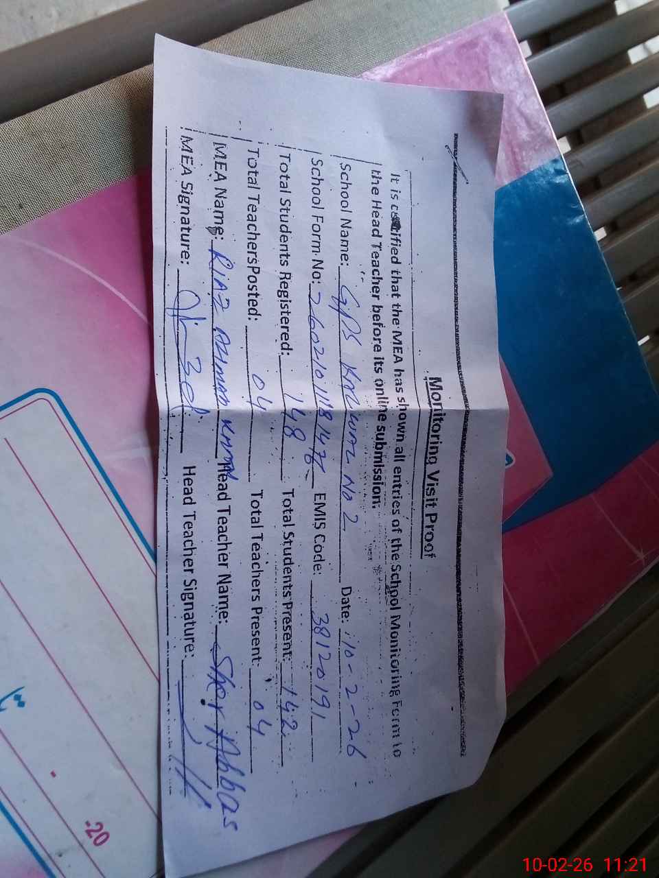 | Attendance Register | Head Teacher | MEA with School | Visit Proof |