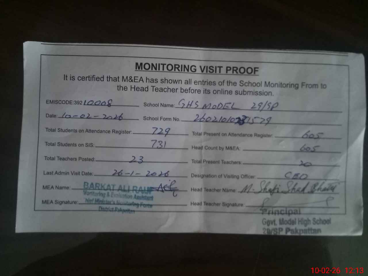 | EMIS Code: 39210008 | Name of School: GHS MODEL 29/SP PAKPATAN | |||
