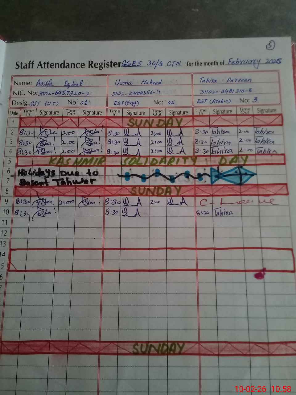 | CNIC | Full Name | Designation | R/C | Absence During Last Calender Month |