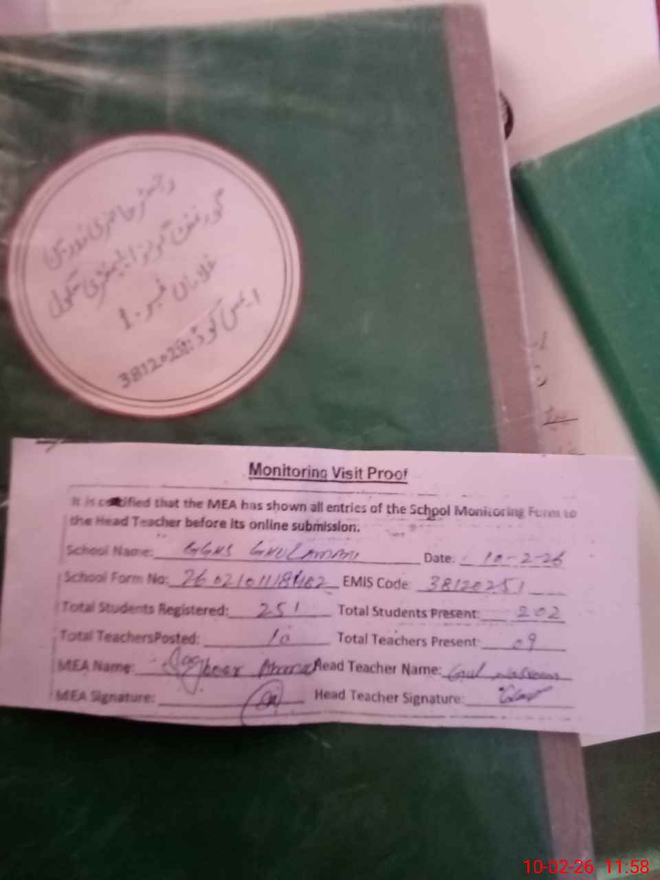 | Attendance Register | Head Teacher | MEA with School | Visit Proof |