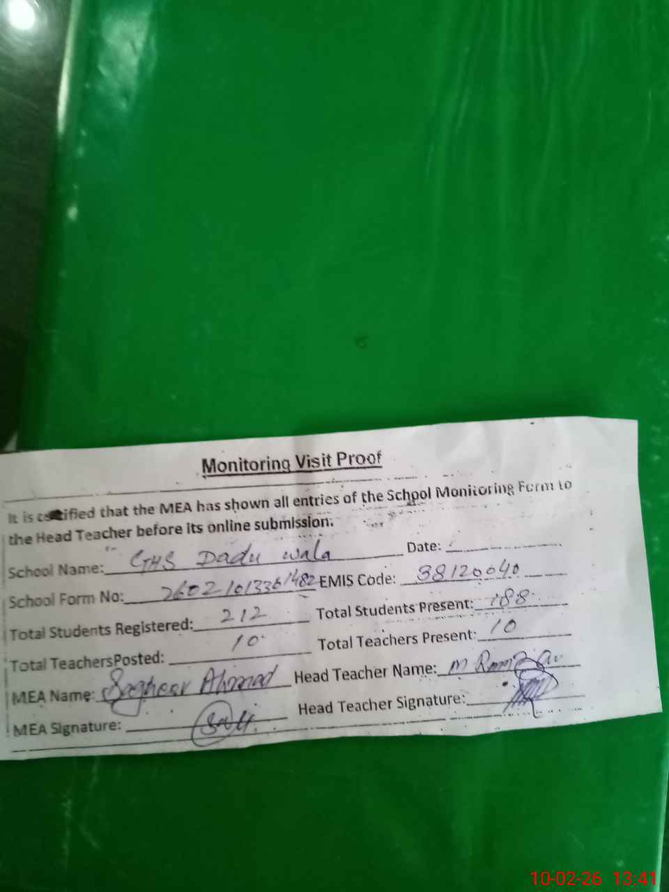 | Certified that this School was Inspected by the Undersigned MEA/DMO Today and the Information Stated Above is as Per Record. | |||||