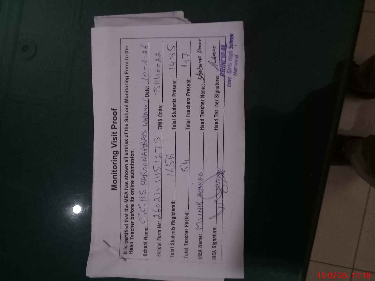 | Certified that this School was Inspected by the Undersigned MEA/DMO Today and the Information Stated Above is as Per Record. | |||||