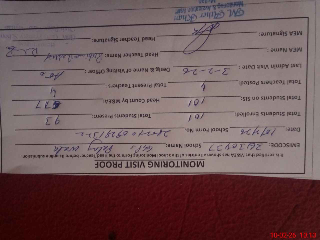 | Certified that this School was Inspected by the Undersigned MEA/DMO Today and the Information Stated Above is as Per Record. | |||||