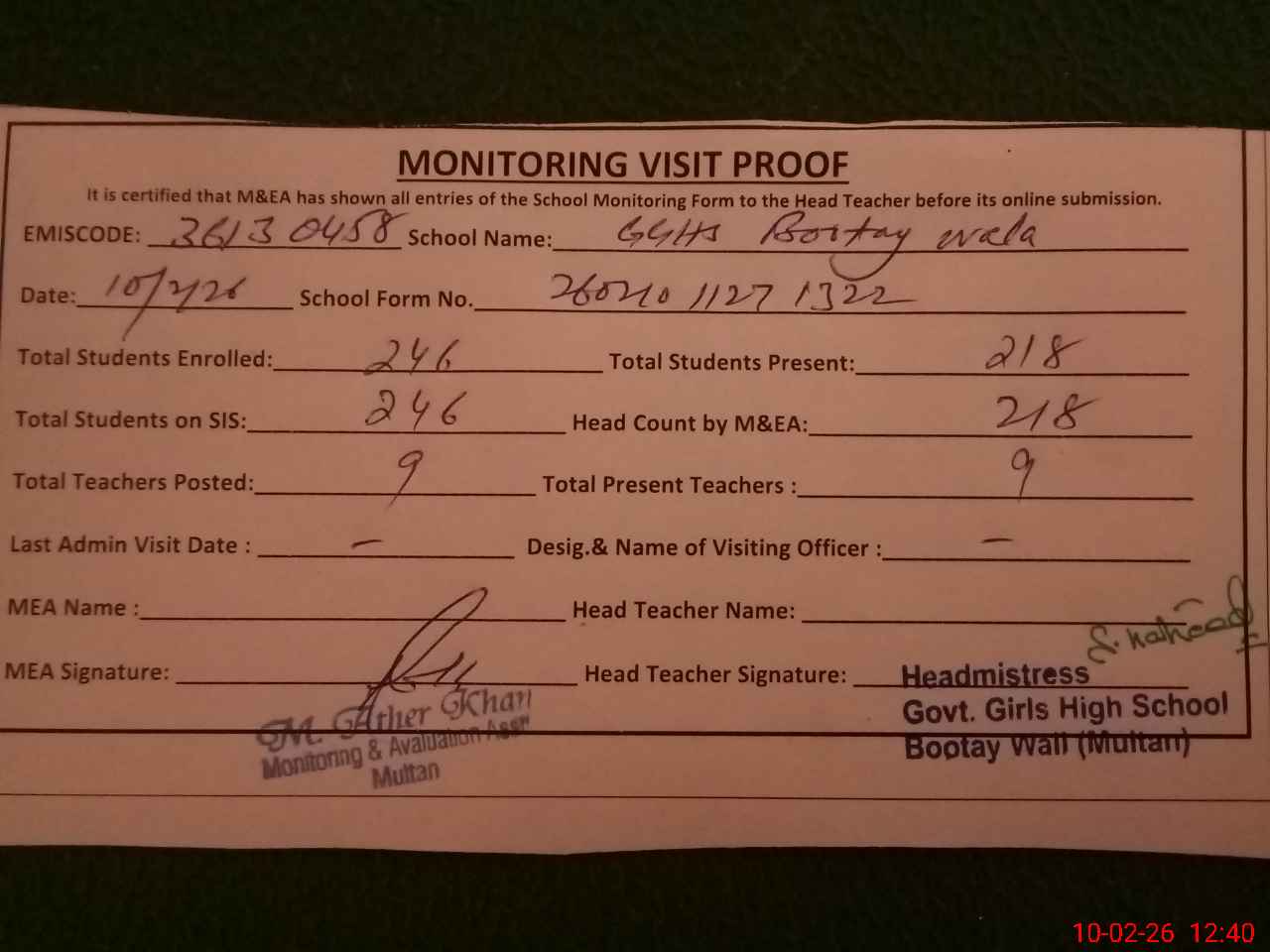 | EMIS Code: 36130458 | Name of School: GGHS BOTAY WALA MAKHDOOM RASHEED | |||