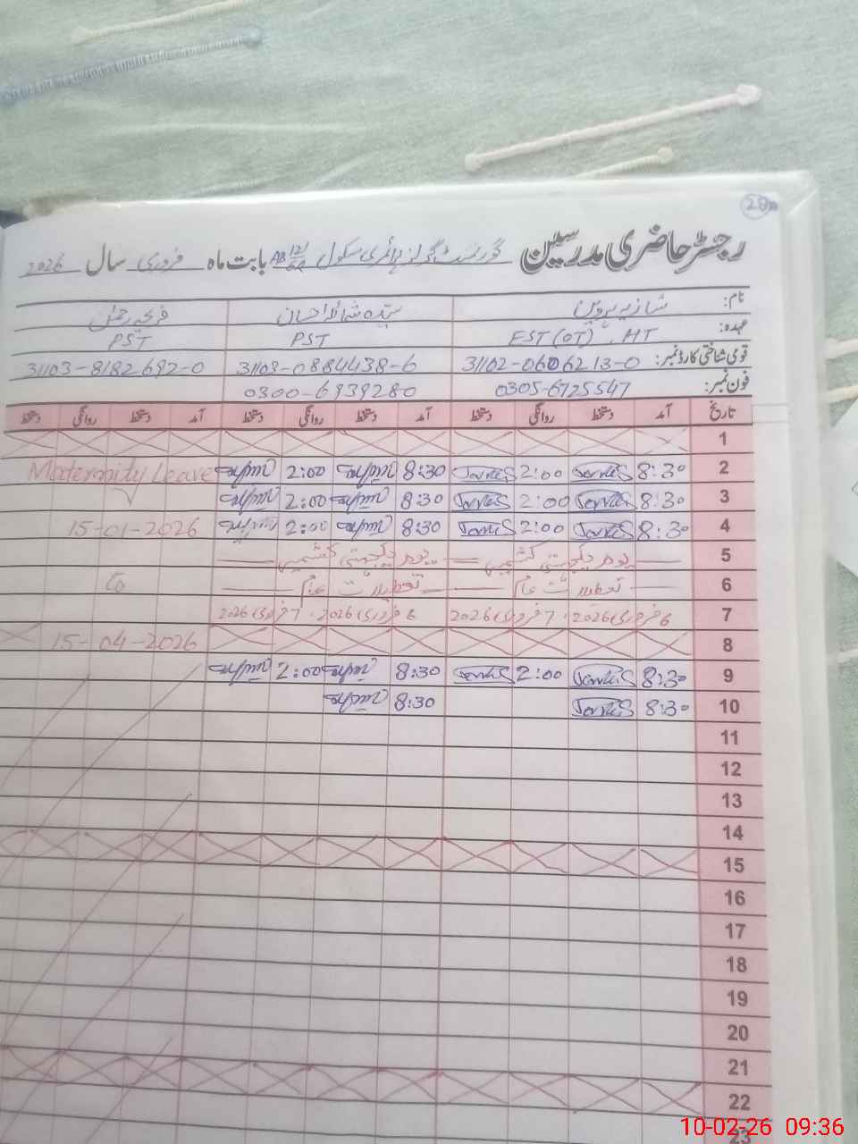 | Remarks (Use Separate Page if Required): pst Fareeha Rehman marked on maternity leave, wef 15/01/26 to 15/04/26 but yet not sanctioned | |||||