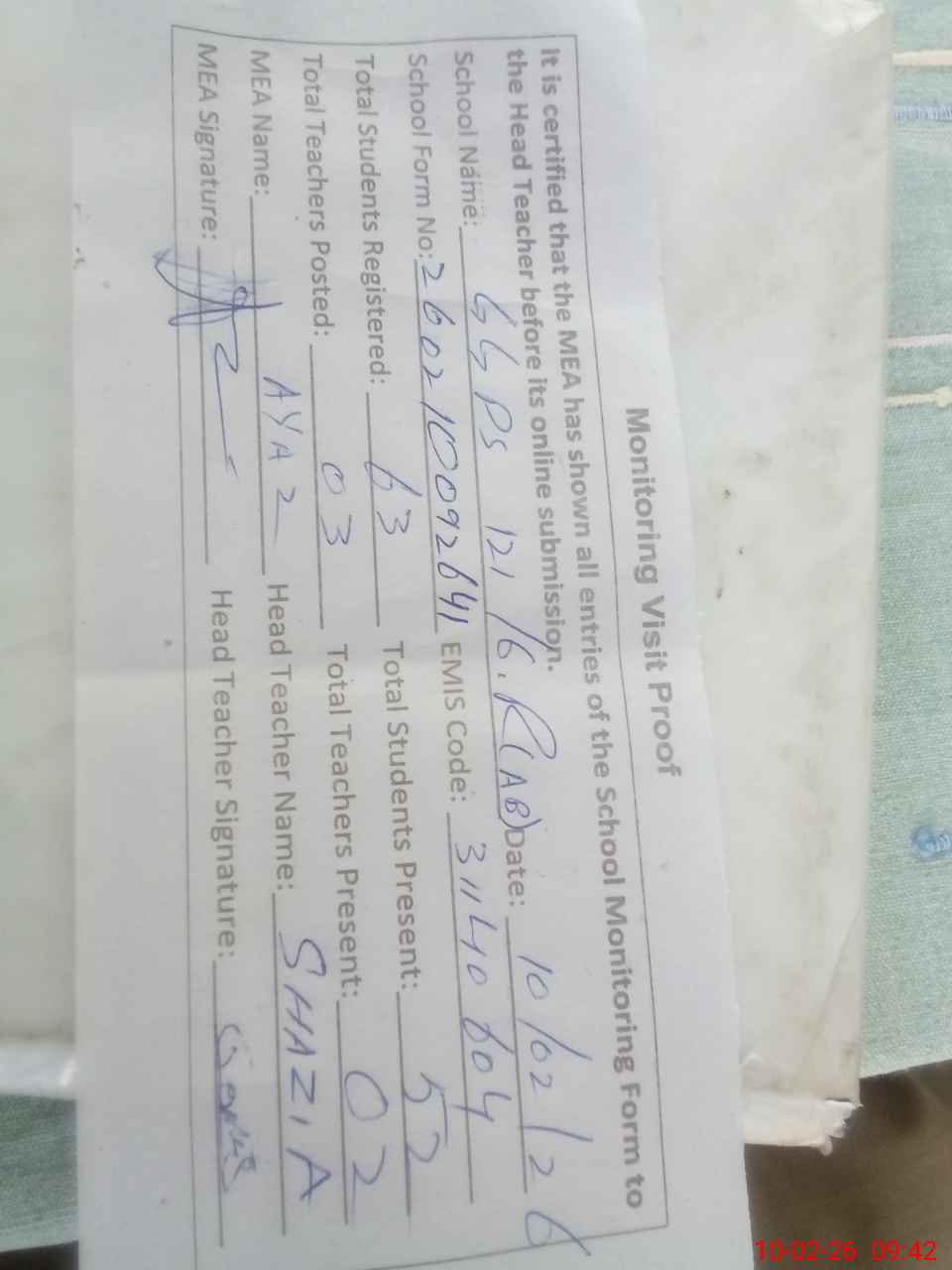 | EMIS Code: 31140604 | Name of School: GGPS CHAK NO.121/6-R AB | |||