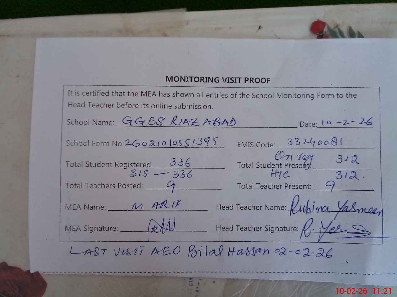 | EMIS Code: 33240081 | Name of School: GGES RIAZ ABAD | |||