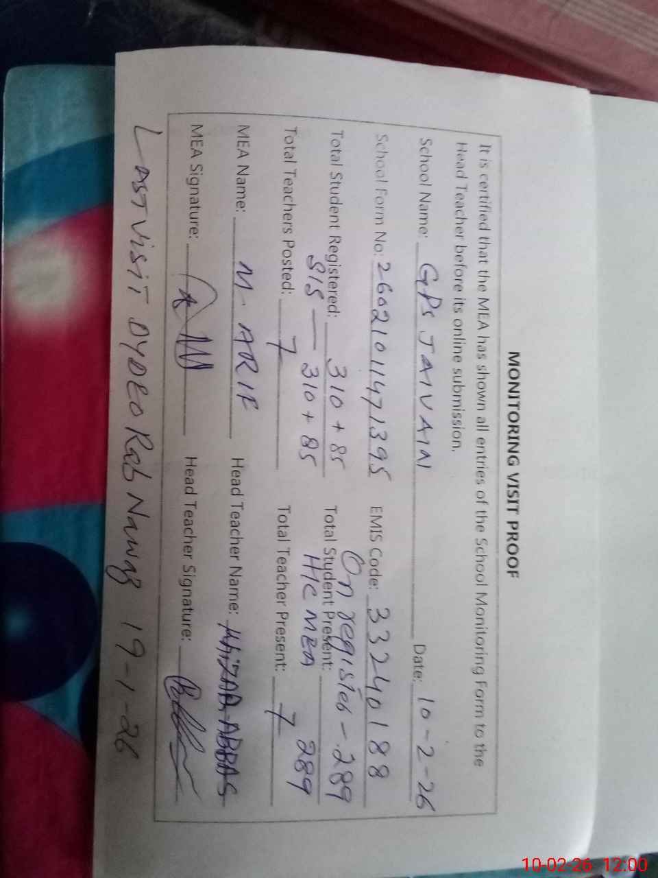 | Certified that this School was Inspected by the Undersigned MEA/DMO Today and the Information Stated Above is as Per Record. | |||||