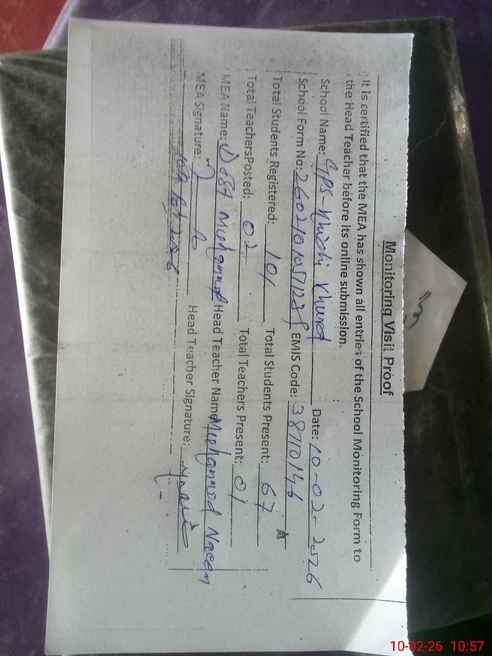 | Attendance Register | Head Teacher | MEA with School | Visit Proof |