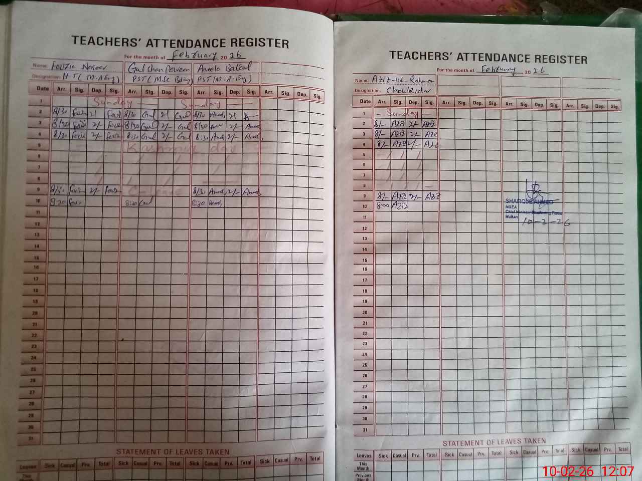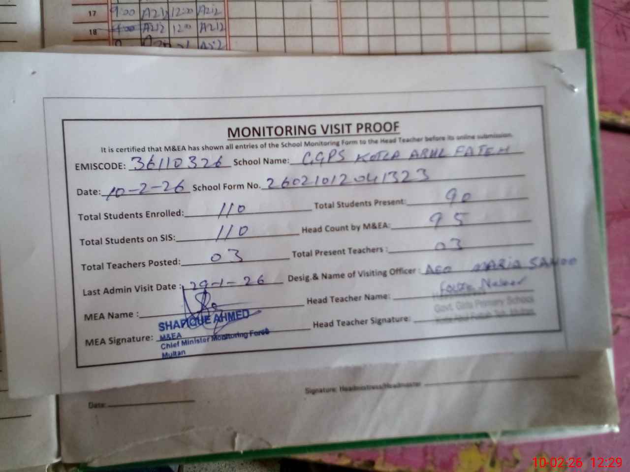 | Attendance Register | Head Teacher | MEA with School | Visit Proof |
