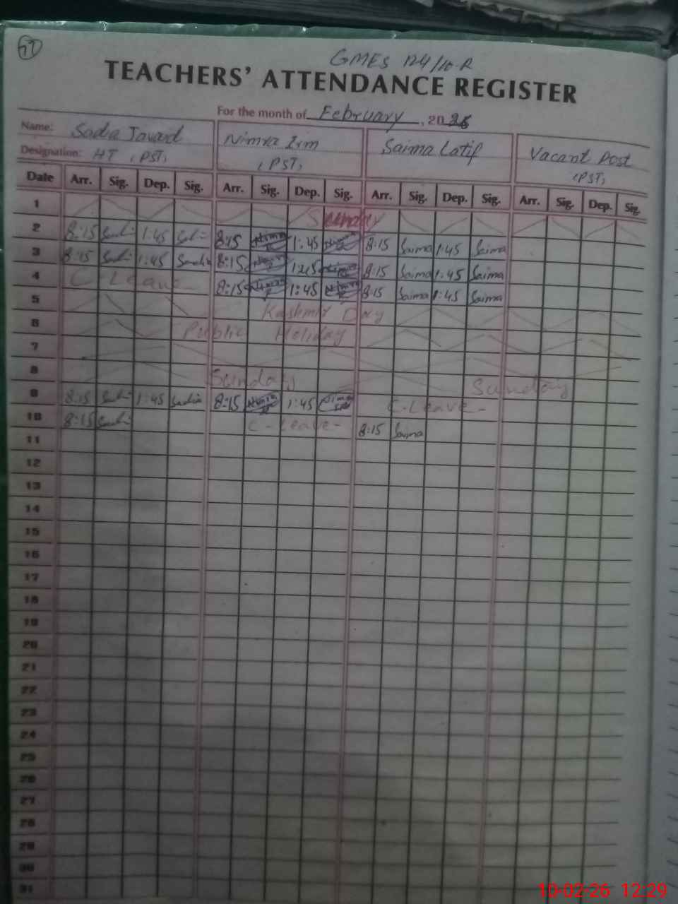 | CNIC | Full Name | Designation | R/C | Absence During Last Calender Month |