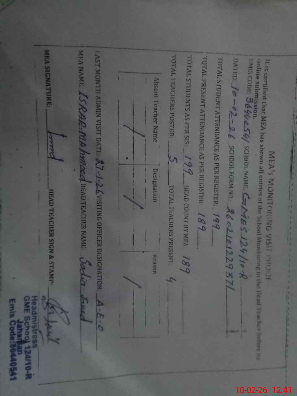 | Certified that this School was Inspected by the Undersigned MEA/DMO Today and the Information Stated Above is as Per Record. | |||||