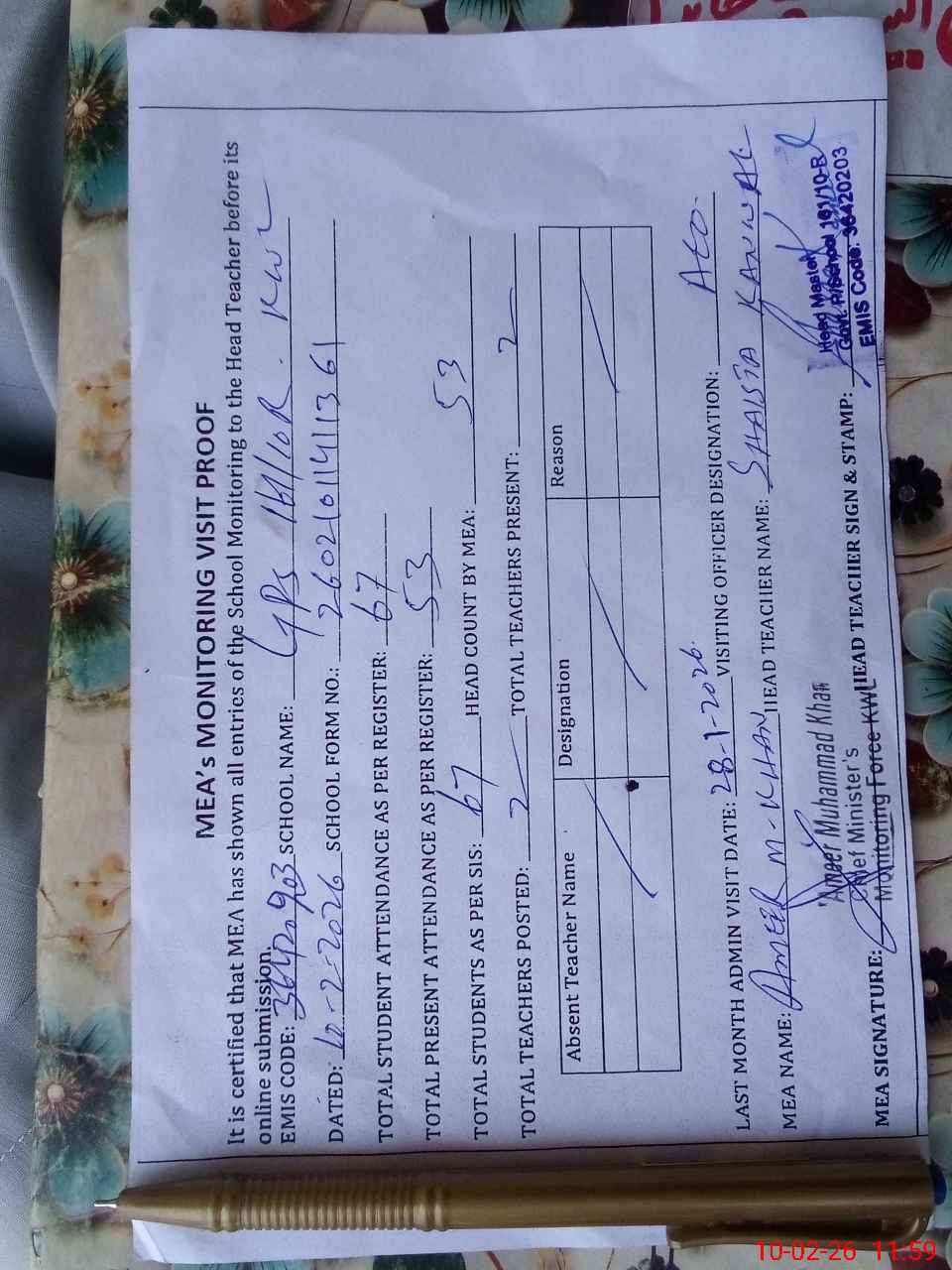 | Attendance Register | Head Teacher | MEA with School | Visit Proof |