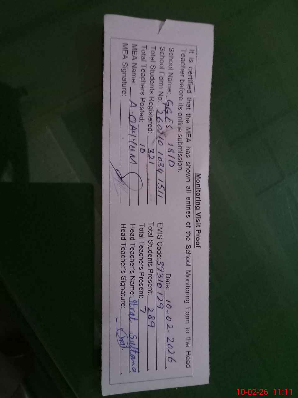 | Attendance Register | Head Teacher | MEA with School | Visit Proof |