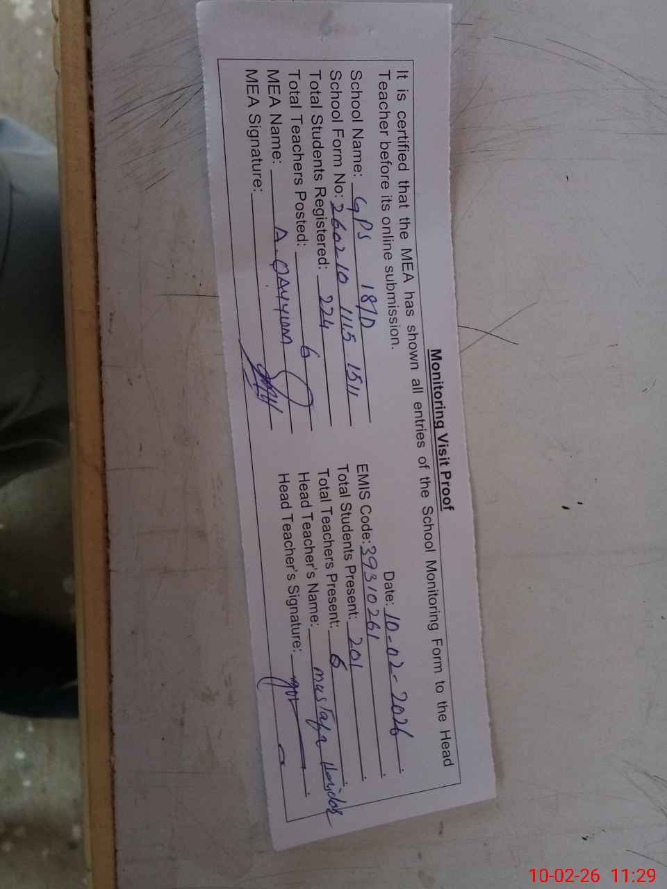 | Attendance Register | Head Teacher | MEA with School | Visit Proof |