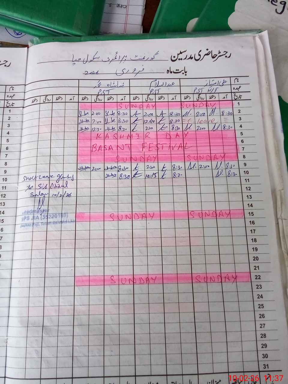 | Remarks (Use Separate Page if Required): PST Abdul Salam has gone on short leave at about 1015 hours because of an emergency departure time marked in attendance register Present students percentage is 79 percent by head count 35220180 | |||||