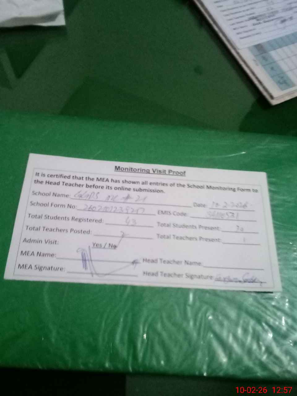 | Attendance Register | Head Teacher | MEA with School | Visit Proof |