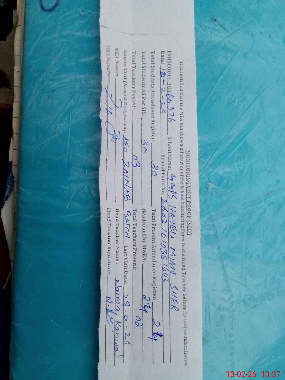 | Monitoring Date: 10-02-2026 | Start Time: 10-02-2026 10:13 AM | End Time: 10-02-2026 10:37 AM | Name of MEA: ZI**** ULHA**** | |