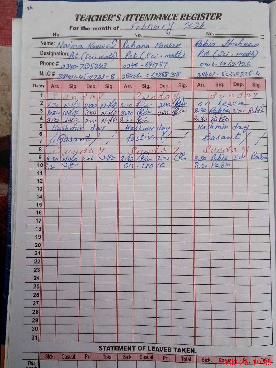 | CNIC | Full Name | Designation | R/C | Absence During Last Calender Month |