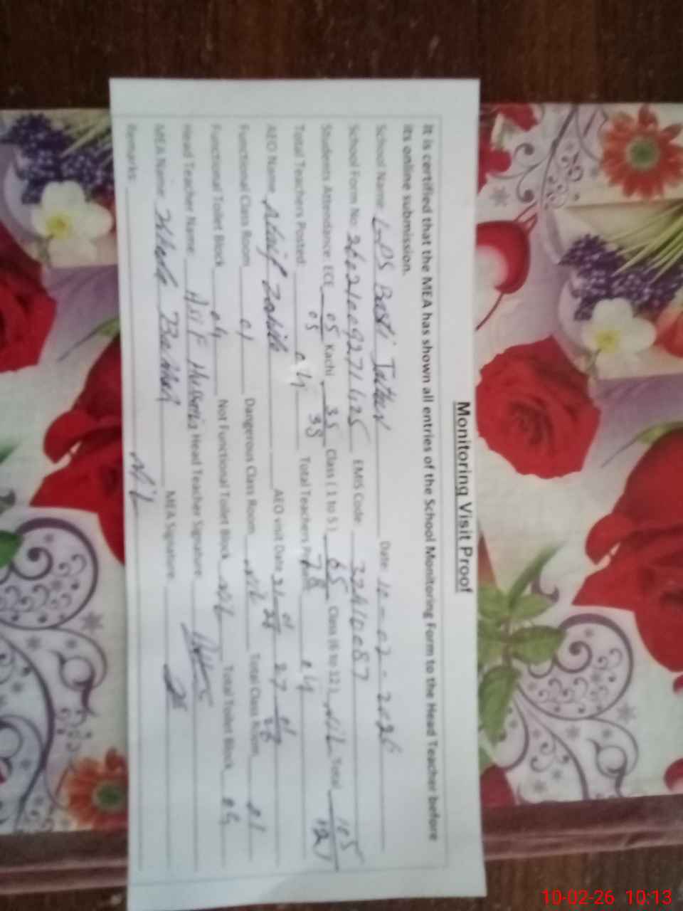 | Certified that this School was Inspected by the Undersigned MEA/DMO Today and the Information Stated Above is as Per Record. | |||||