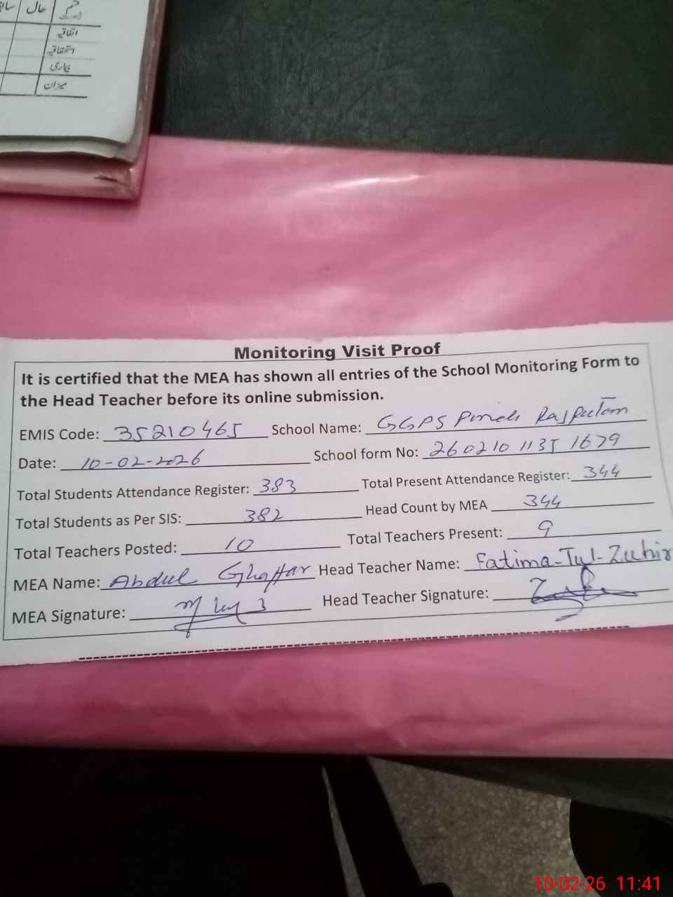 | Attendance Register | Head Teacher | MEA with School | Visit Proof |