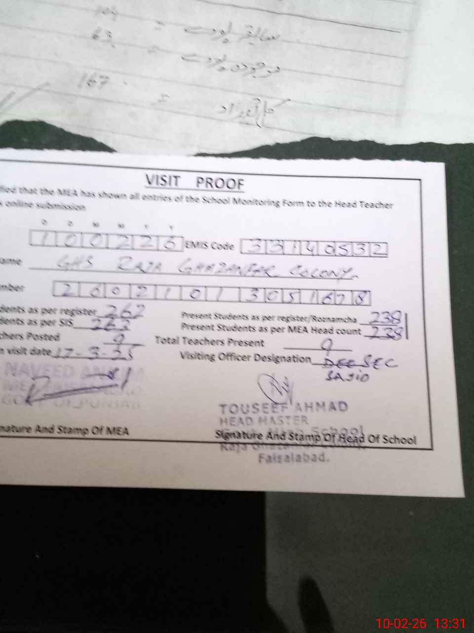 | EMIS Code: 33140532 | Name of School: GHS RAJA GAZANFAR COLONY LABOUR COLONY FSD | |||