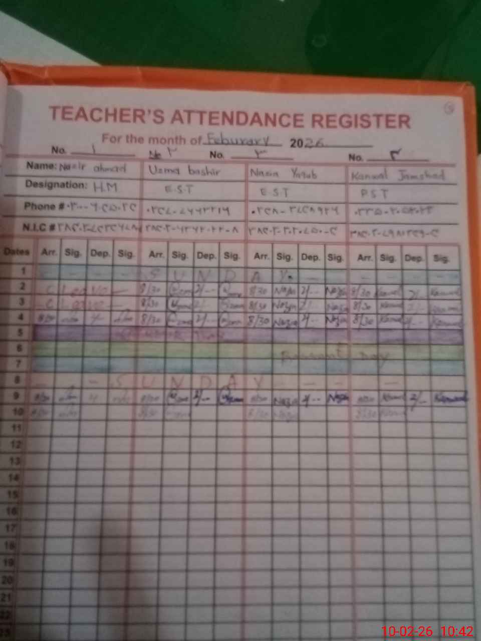 | CNIC | Full Name | Designation | R/C | Absence During Last Calender Month |