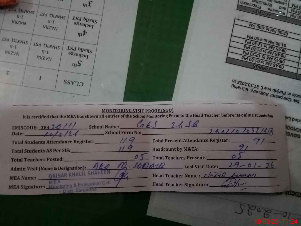 | Attendance Register | Head Teacher | MEA with School | Visit Proof |