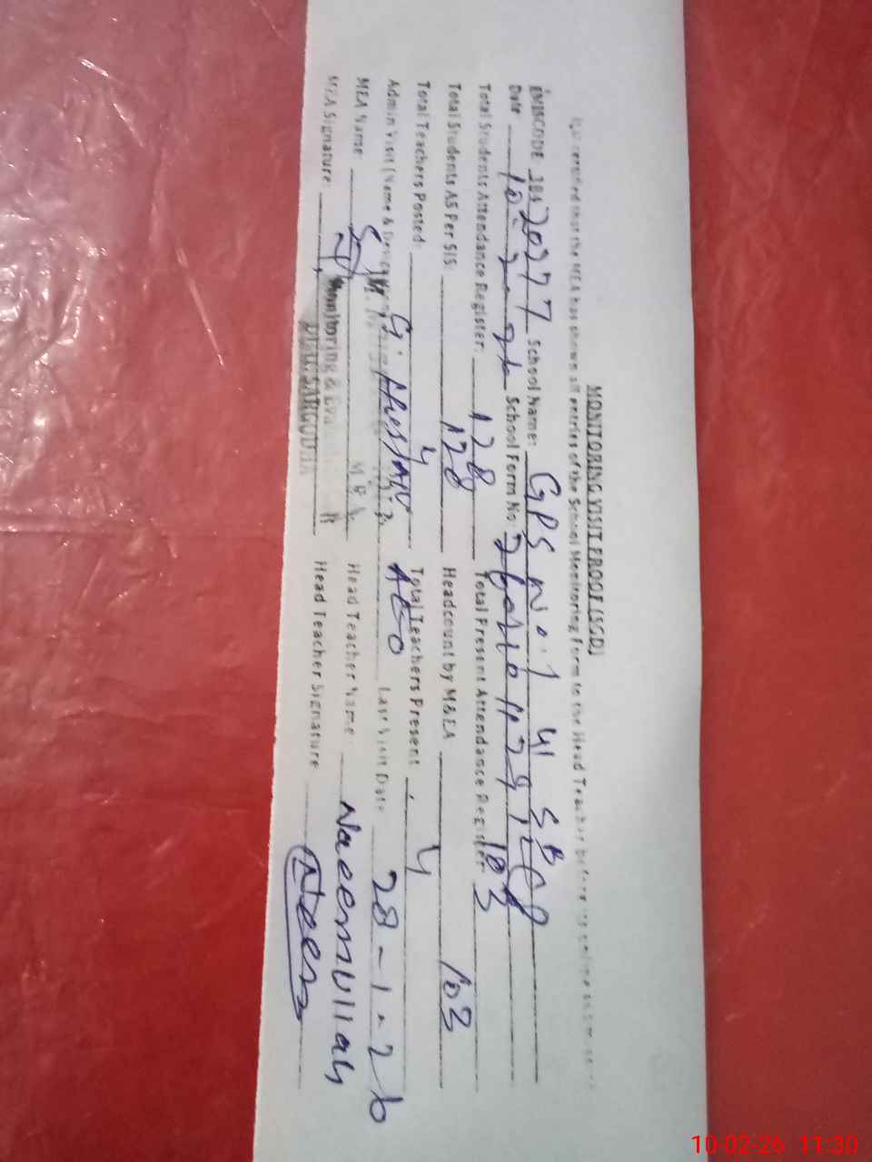 | Attendance Register | Head Teacher | MEA with School | Visit Proof |