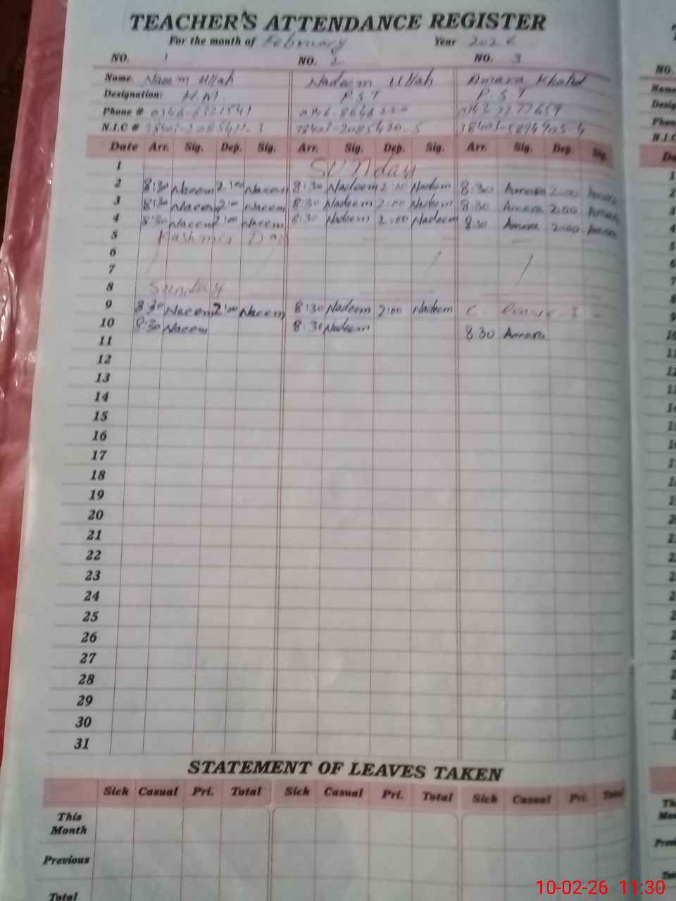 | CNIC | Full Name | Designation | R/C | Absence During Last Calender Month |