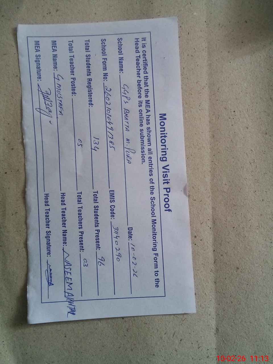 | Certified that this School was Inspected by the Undersigned MEA/DMO Today and the Information Stated Above is as Per Record. | |||||