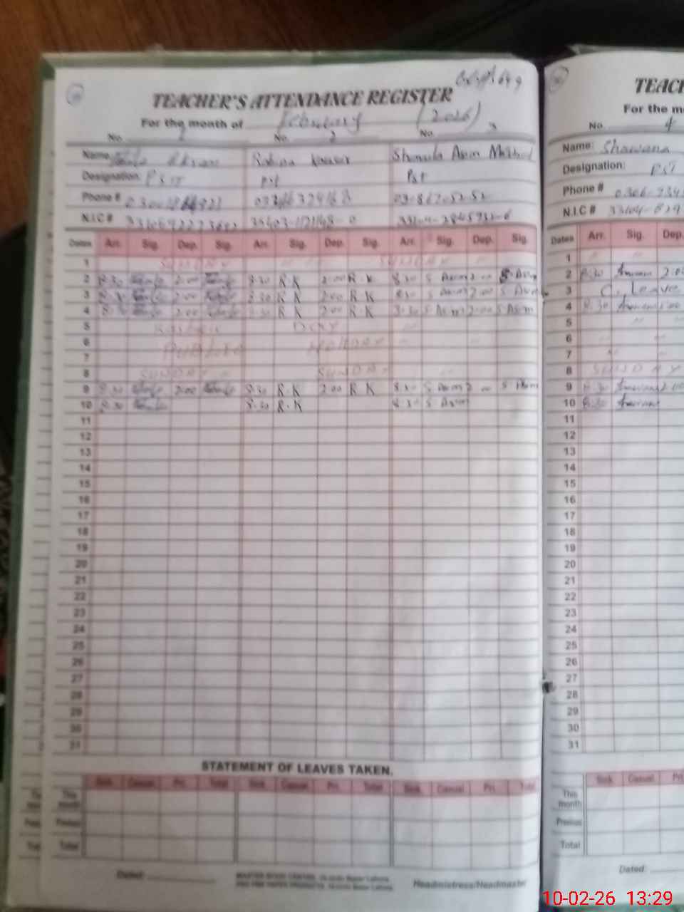 | CNIC | Full Name | Designation | R/C | Absence During Last Calender Month |