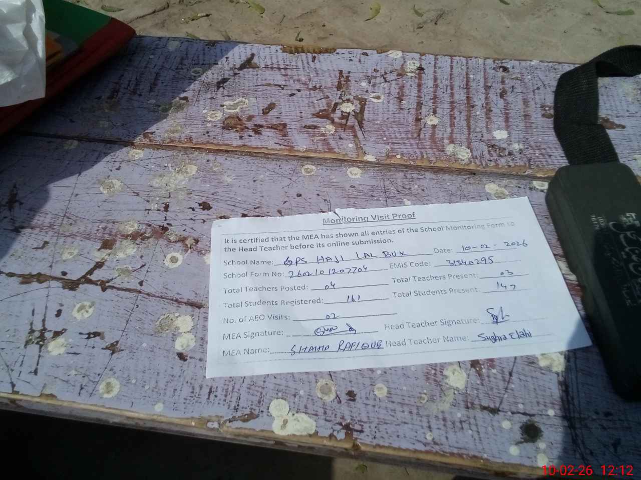 | Attendance Register | Head Teacher | MEA with School | Visit Proof |