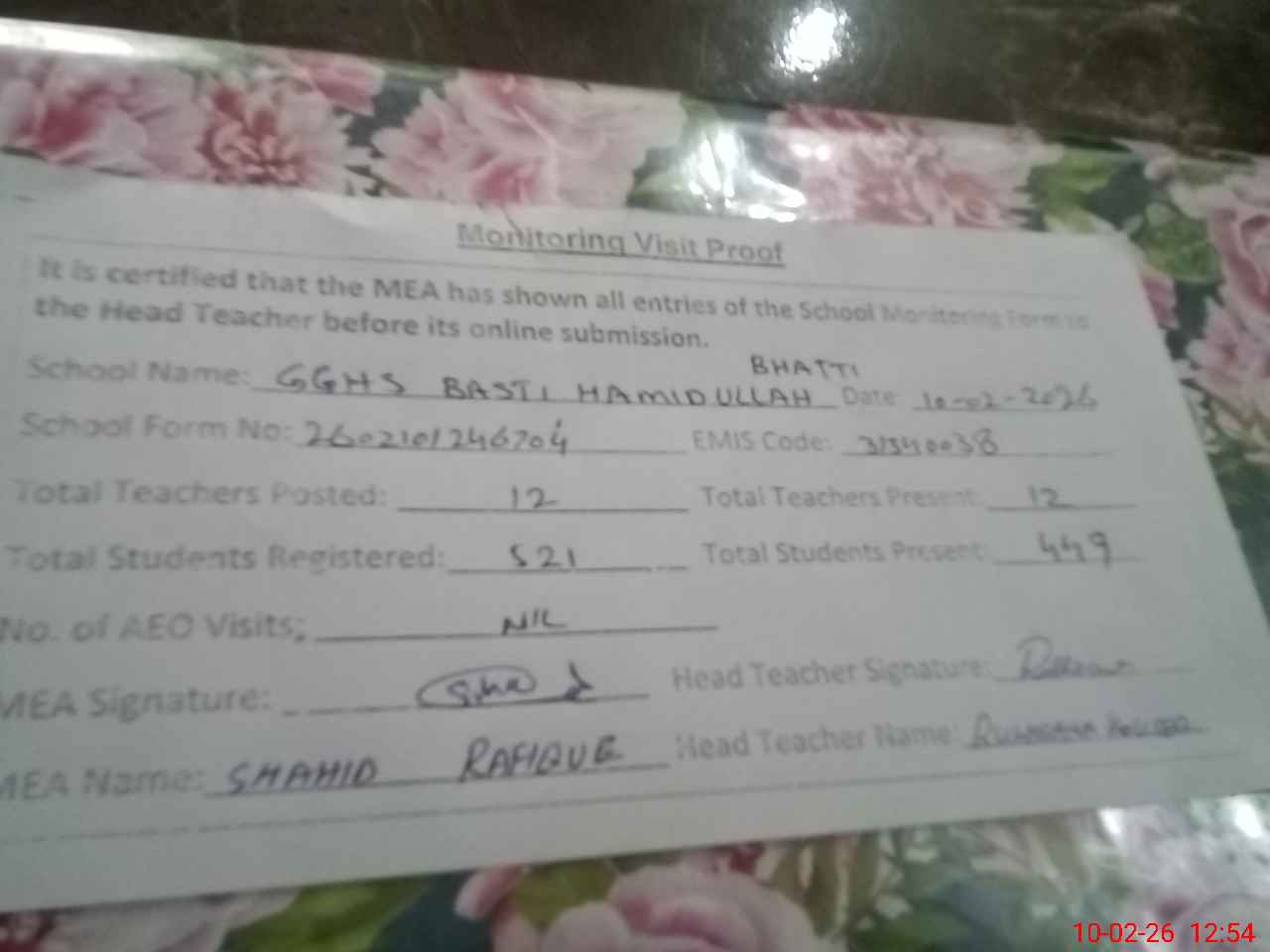| EMIS Code: 31340038 | Name of School: GGHS BASTI HAMID ULLAH BHATTI | |||